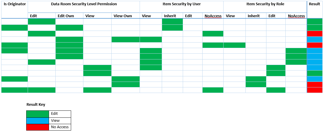 - If not users or roles are set on an item then default security is it is open to all based Data Room security level permissions and the Data Room mode.