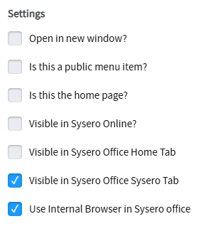 - Use Internal Browser in Sysero Office : This determins whether it opens within the Office environment or externally in a normal web browser. Generally most Sysero internal pages should have this checked, any external pages should not have it checked.